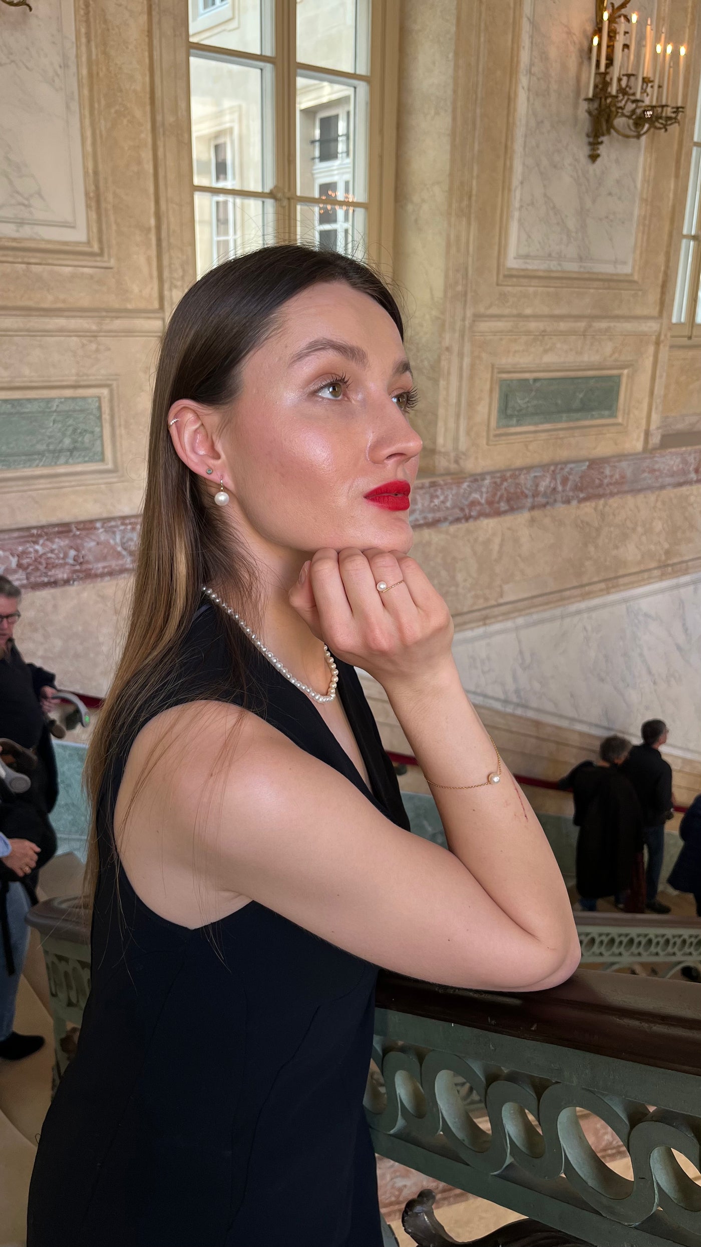 Wearing: Cascade Drop Pearl Earrings