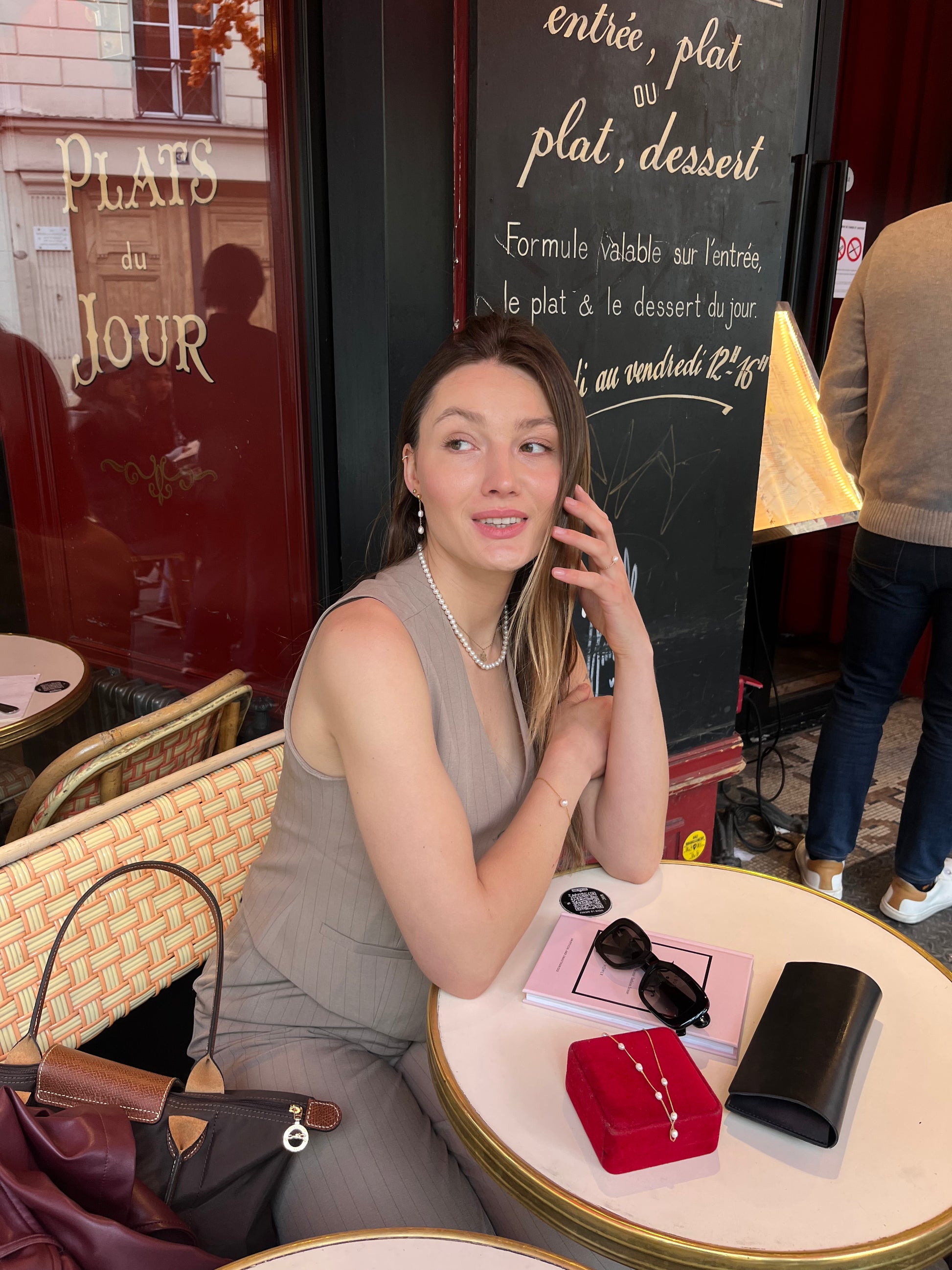 A stunning pair of drop earrings featuring two radiant pearls suspended from a delicate gold chain. These earrings add a touch of elegance and sophistication, perfect for both evening occasions and refined daytime looks.